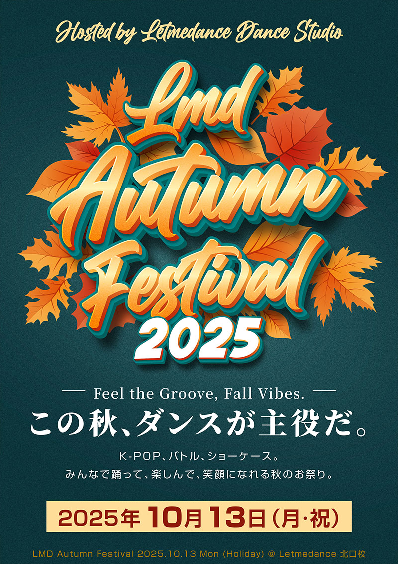 2025年10月13日(祝・月)、Letmedance北口校で「LMD Autumn Festival 2025」を開催!ダンスショーケース、K-POPランダムダンス、キッズダンスバトル、無料体験レッスンまで盛りだくさん。ダンスが大好きな人も、これから始めてみたい人も、みんなで一緒に楽しめる秋のお祭りです。