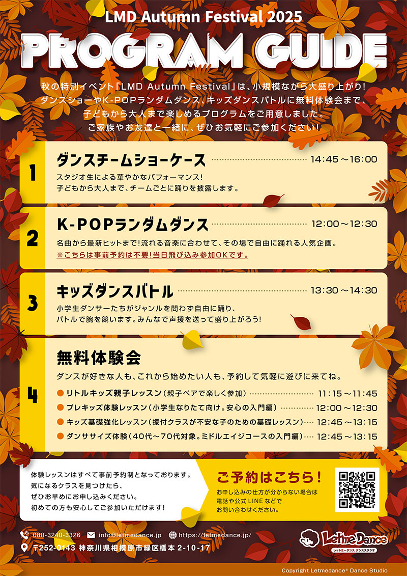 2025年10月13日(祝・月)、Letmedance北口校で「LMD Autumn Festival 2025」を開催!ダンスショーケース、K-POPランダムダンス、キッズダンスバトル、無料体験レッスンまで盛りだくさん。ダンスが大好きな人も、これから始めてみたい人も、みんなで一緒に楽しめる秋のお祭りです。